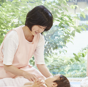 SIDS(乳幼児突然死症候群)対策等、安心安全はもちろんの事、愛着関係を大切に、ひとりひとり個別のカリキュラムを立て、子ども達の育ちの為に、今何が一番大切かを考え、ご家庭と連携しながら、ゆったりと生活しています。 手指等の感覚器官をたくさん使う事や愛情に満ちた働きかけは、脳神経の発達に大変重要と考え、日々の保育に取り入れています。